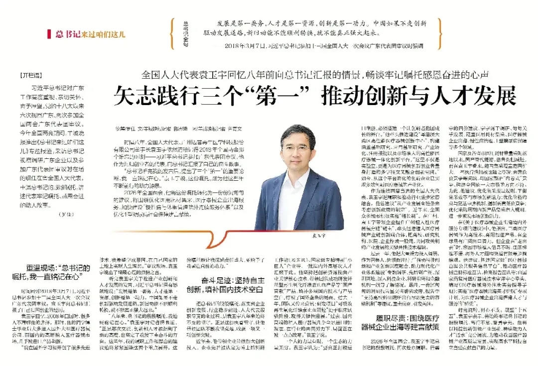 时隔八年,全国人大代表、广州迈普再生医学科技股份有限公司董事长袁玉宇依然清晰记得2018年全国两会那个难忘的时刻——习近平总书记参加广东代表团审议,他作为海归创业者的代表,向总书记汇报了自己的奋斗故事。