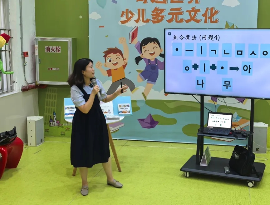 骤雨初歇的午后,广州少年儿童图书馆二楼外文馆化身热闹的“文化魔法学院”,30余名大小读者齐聚一堂,共同迎接韩国专场的文化盛宴。本次活动特邀广东外语外贸大学亚非语言文化学院朝鲜语系主任易超副教授(博士)主讲,以《熊女神的字灵魔法书》为主题,开启了一场穿越四千年的神话与文字之旅。