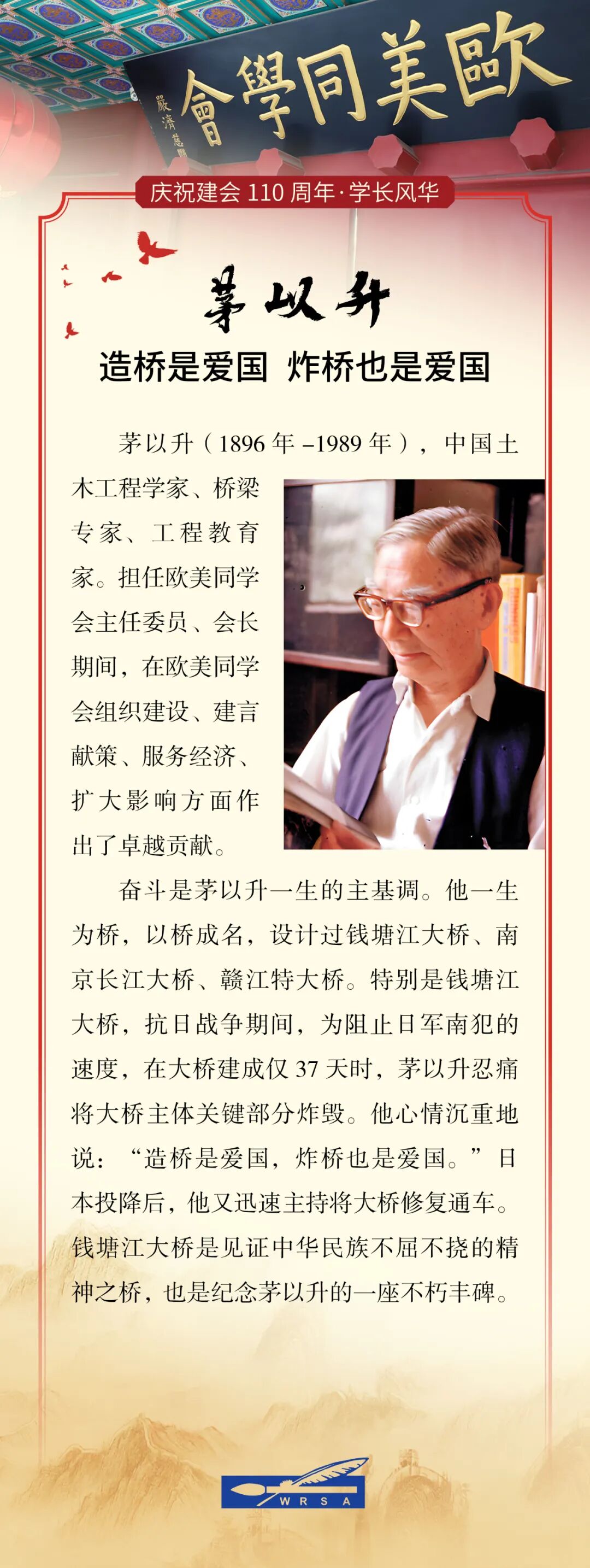 编者按:时序更替,华章日新。今年欧美同学会迎来建会110周年。成立百余年来,广大留学人员以“索我理想之中华”为己任,为救亡图存付出了艰辛努力,为民族复兴作出了巨大贡献。请学长们跟随欧美君,聆听百余年波澜壮阔的留学史,感受留学人员和欧美同学会学长们的爱国心、报国志,共同弘扬留学报国的光荣传统,砥砺前行,共圆民族复兴伟大中国梦。
