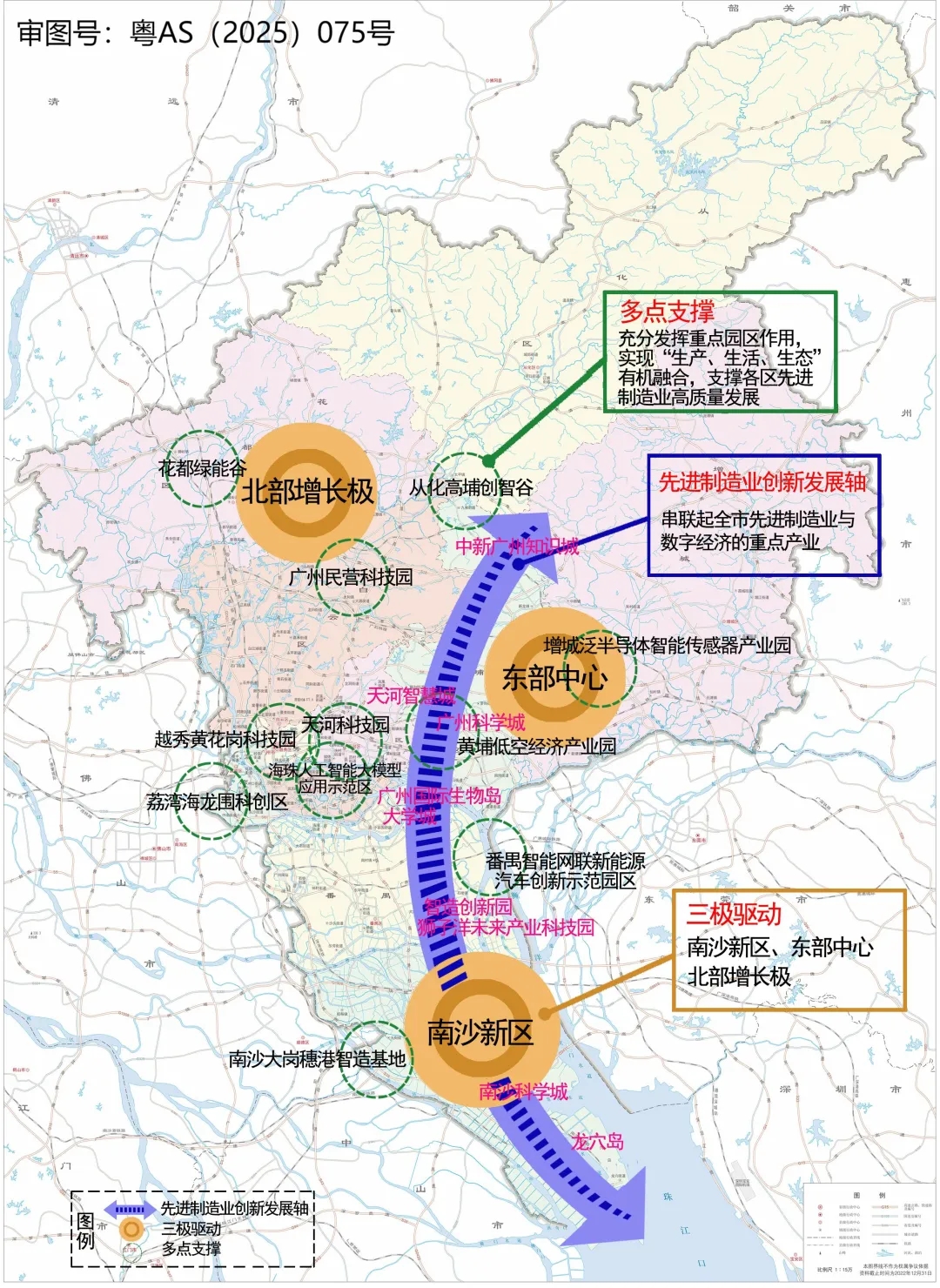 “三极”,即以南沙新区、东部中心、北部增长极为先进制造业基地重要承载区,集聚创新型企业、创新型技术、创新型人才,增强产业链韧性,辐射带动各区制造业向高端化、智能化、绿色化发展。