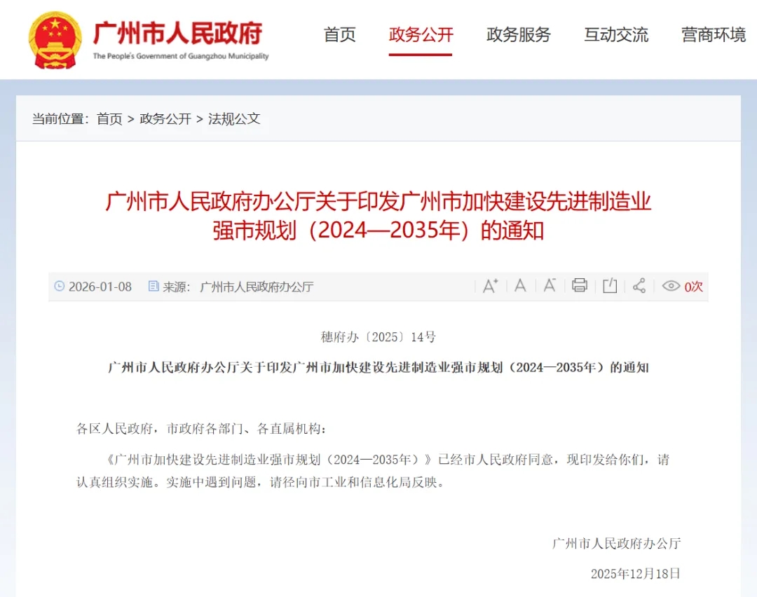 关注 | 到2035年工业增加值翻一番!广州先进制造业强市蓝图出炉近日 广州市人民政府门户网站发布 《广州市加快建设先进制造业强市 规划(2024—2035年)》 (以下简称《规划》)